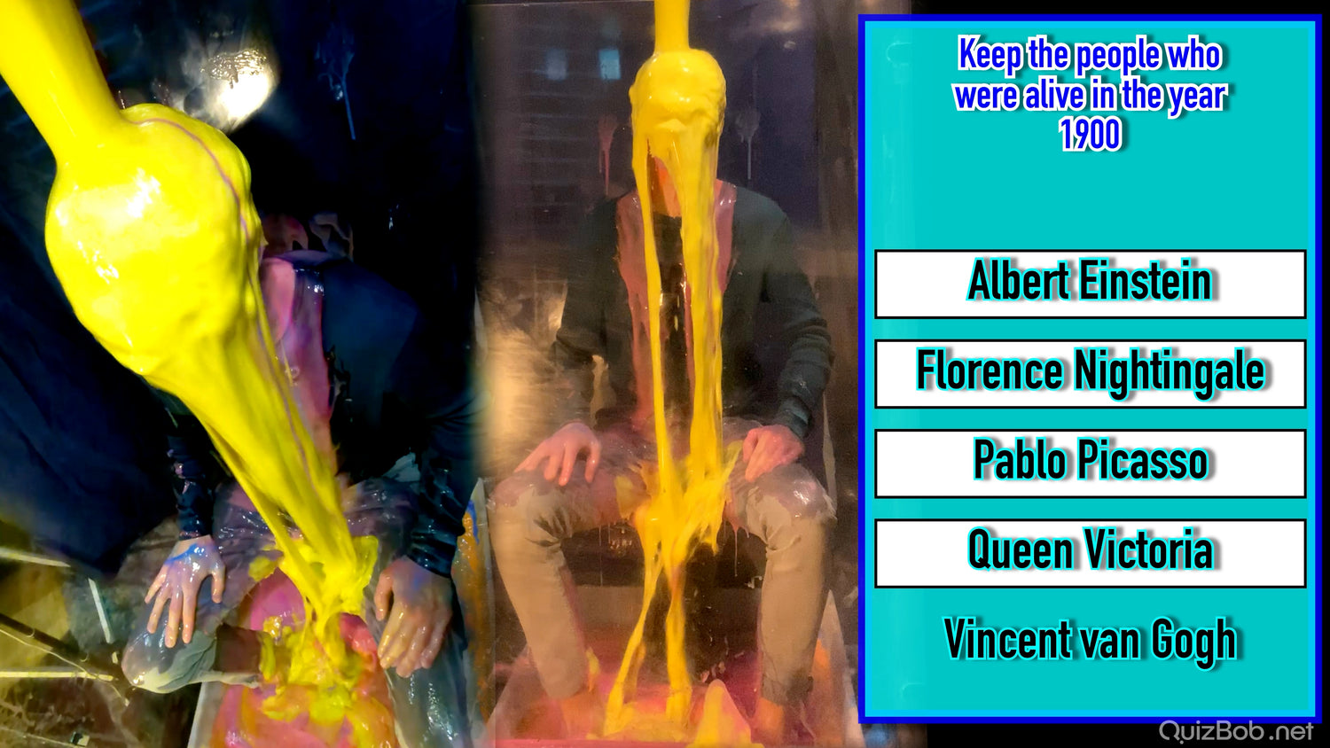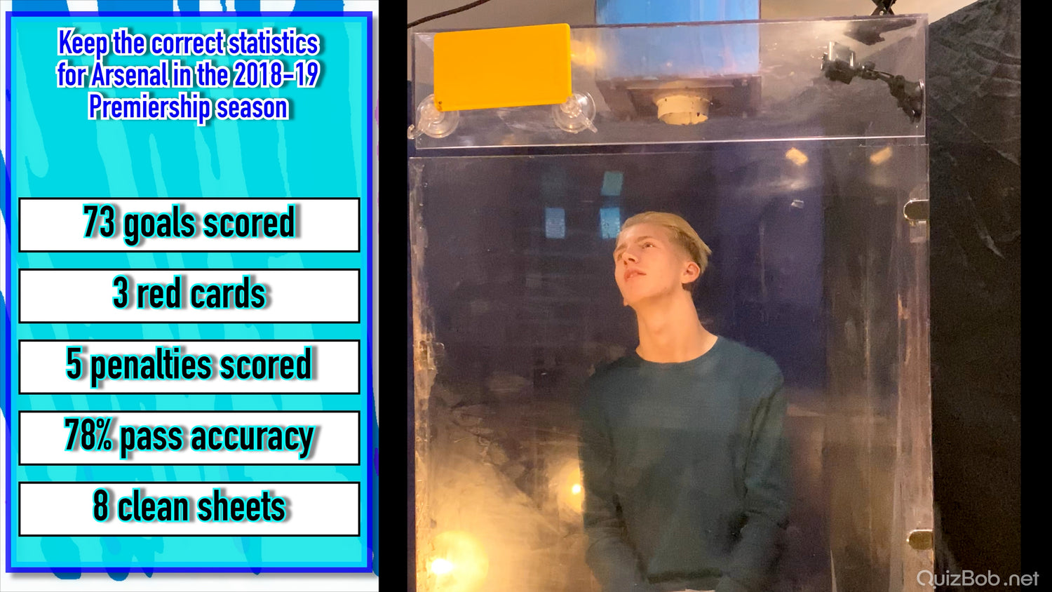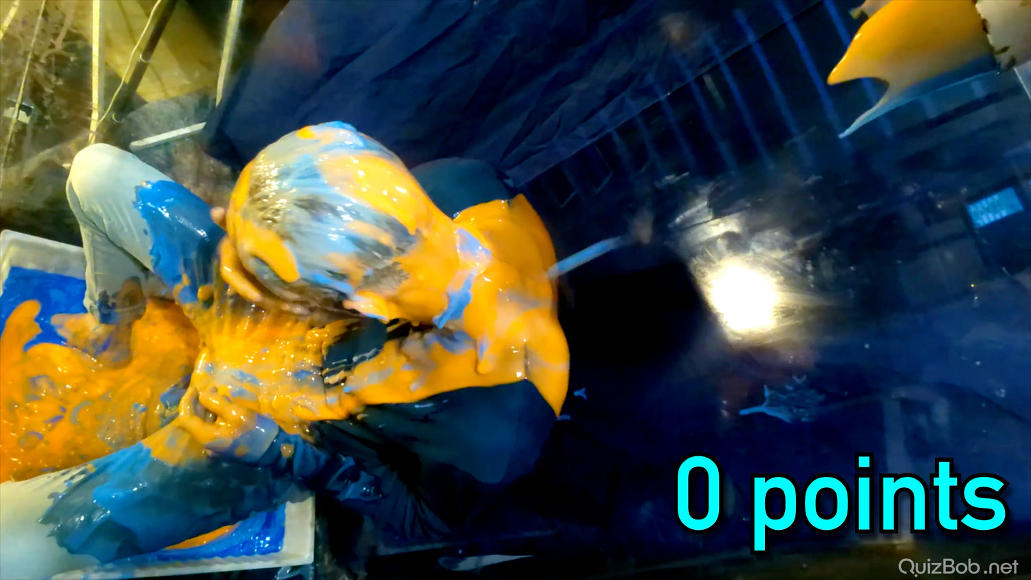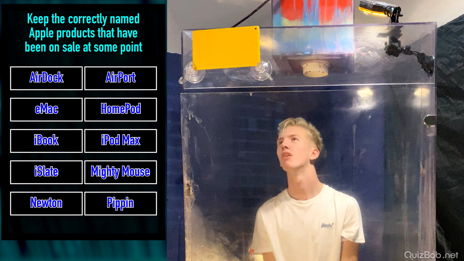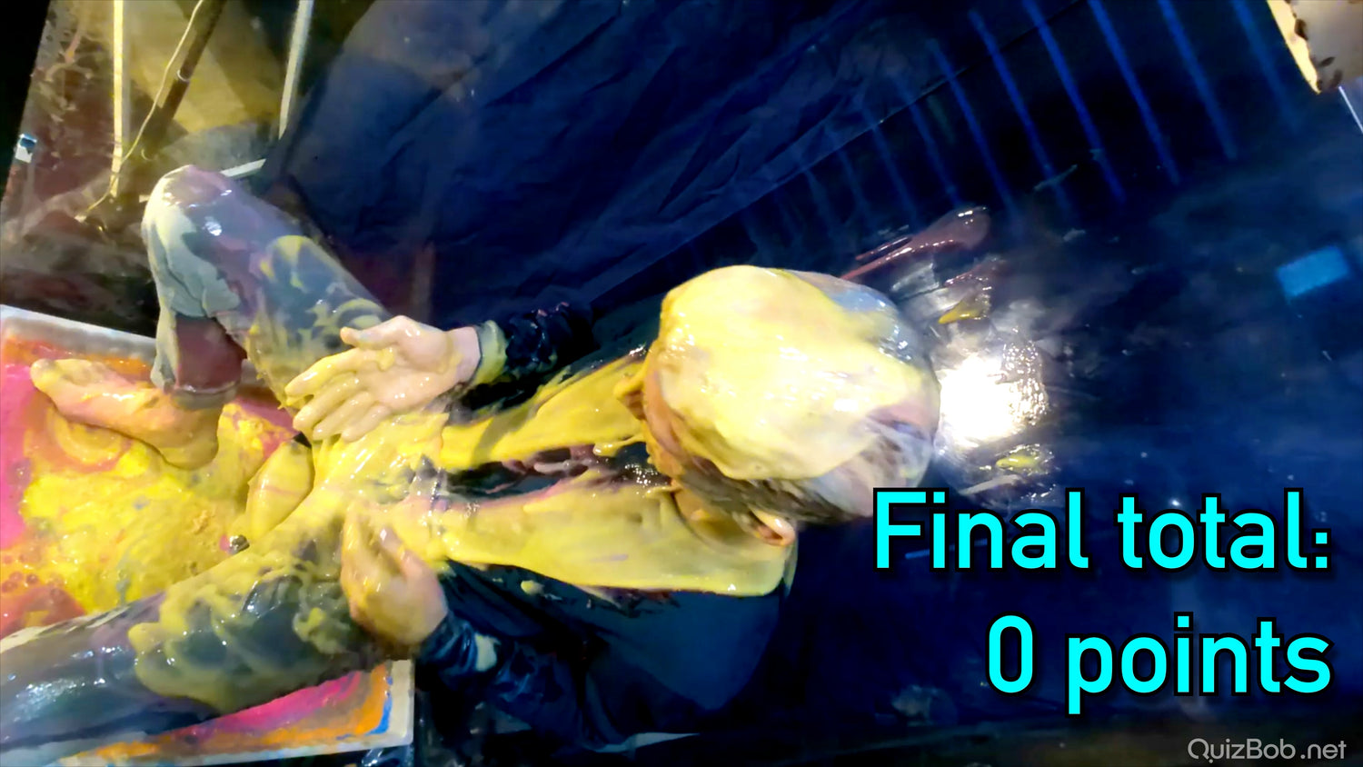 Each time he fails to complete a board in the quiz, a tank of brightly coloured gunge is dropped on him!