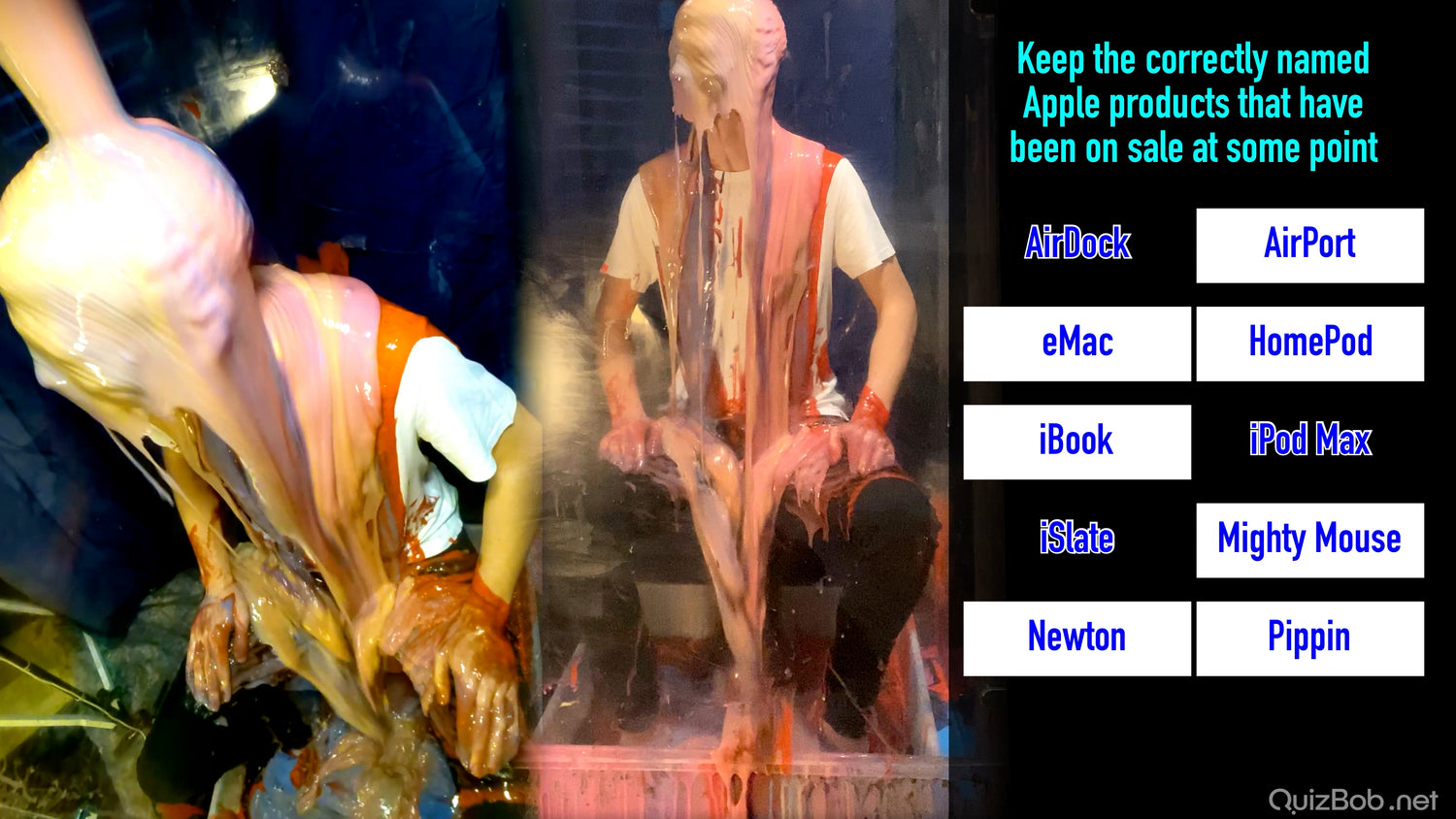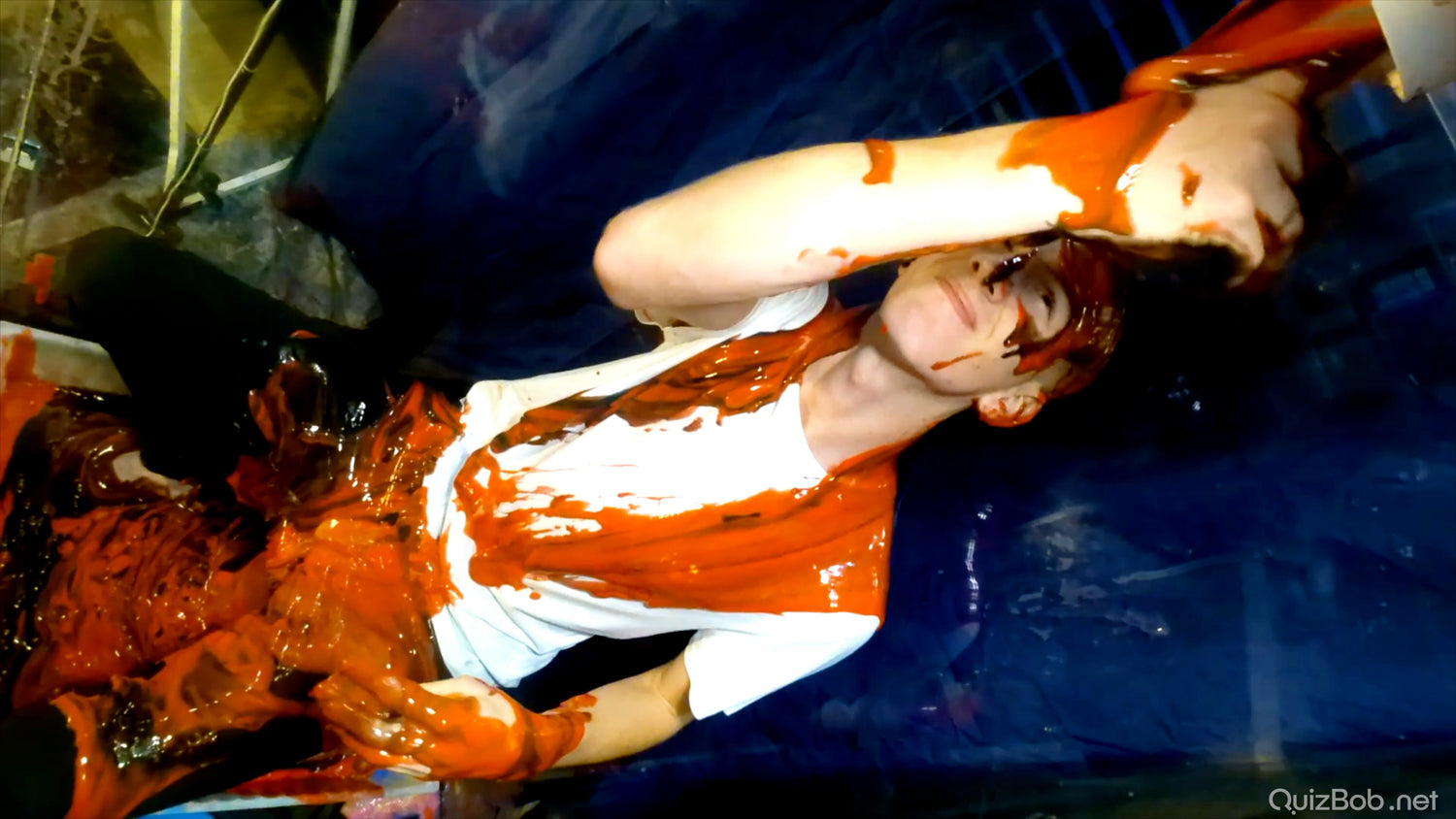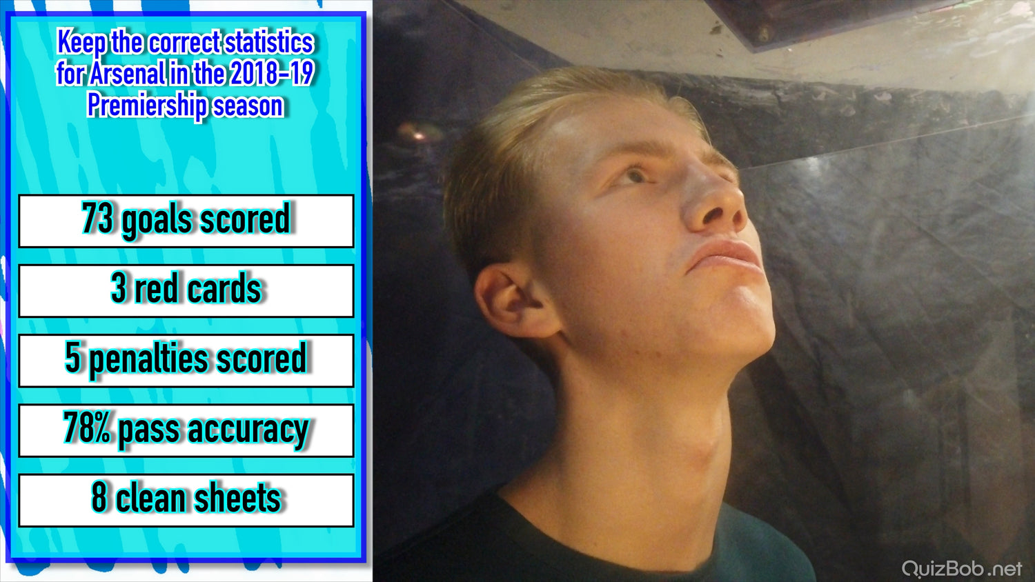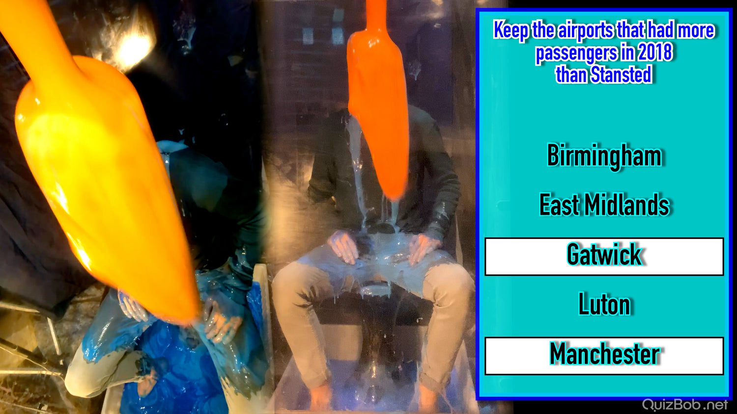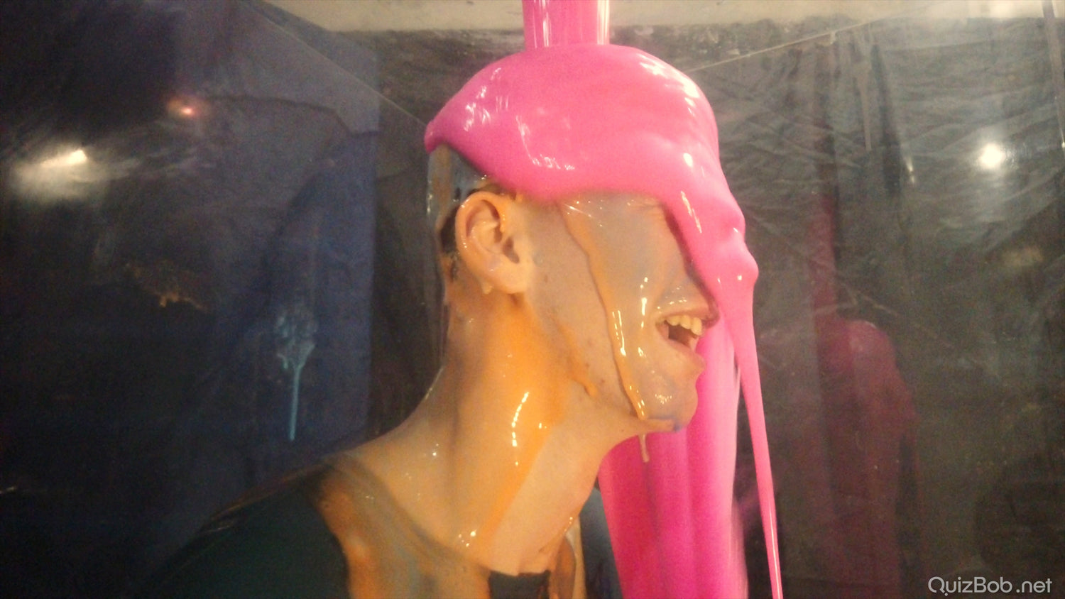 Each time he fails to complete a board in the quiz, a tank of brightly coloured gunge is dropped on him!