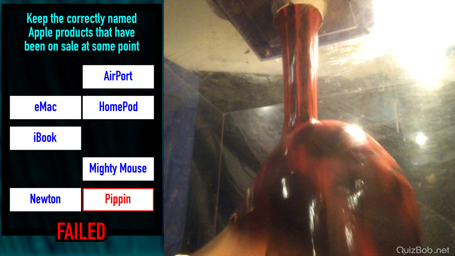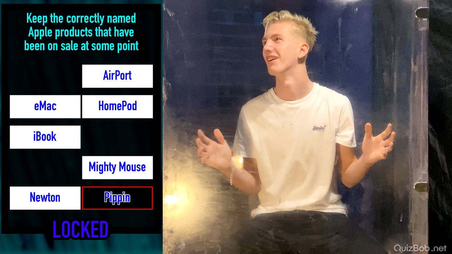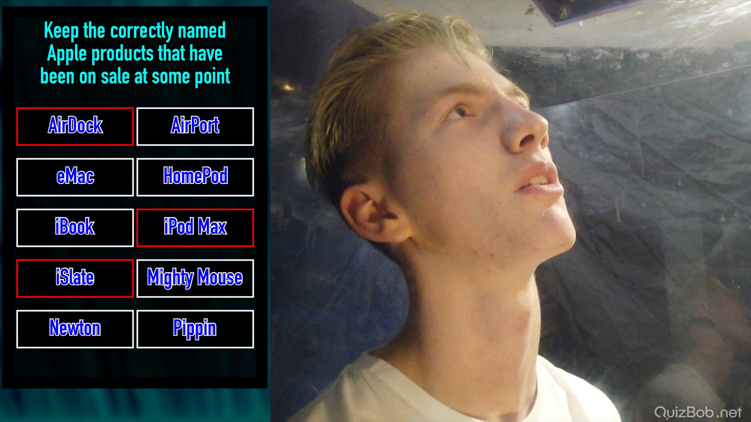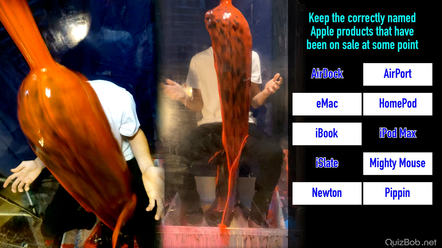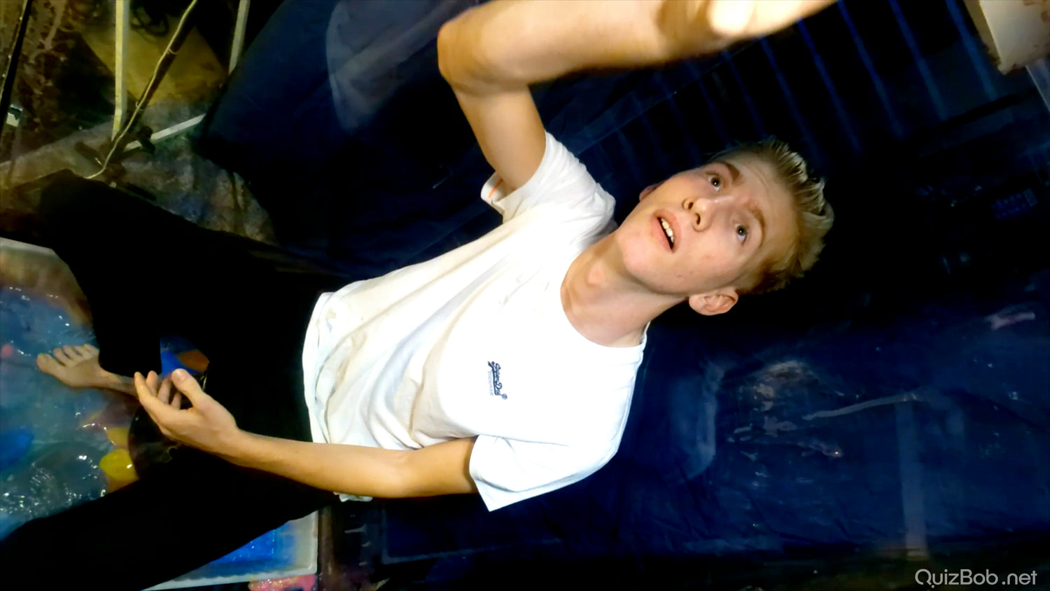 Each time he fails to complete a board in the quiz, a tank of brightly coloured gunge is dropped on him!