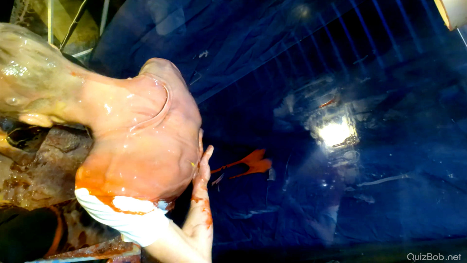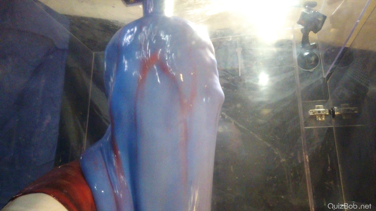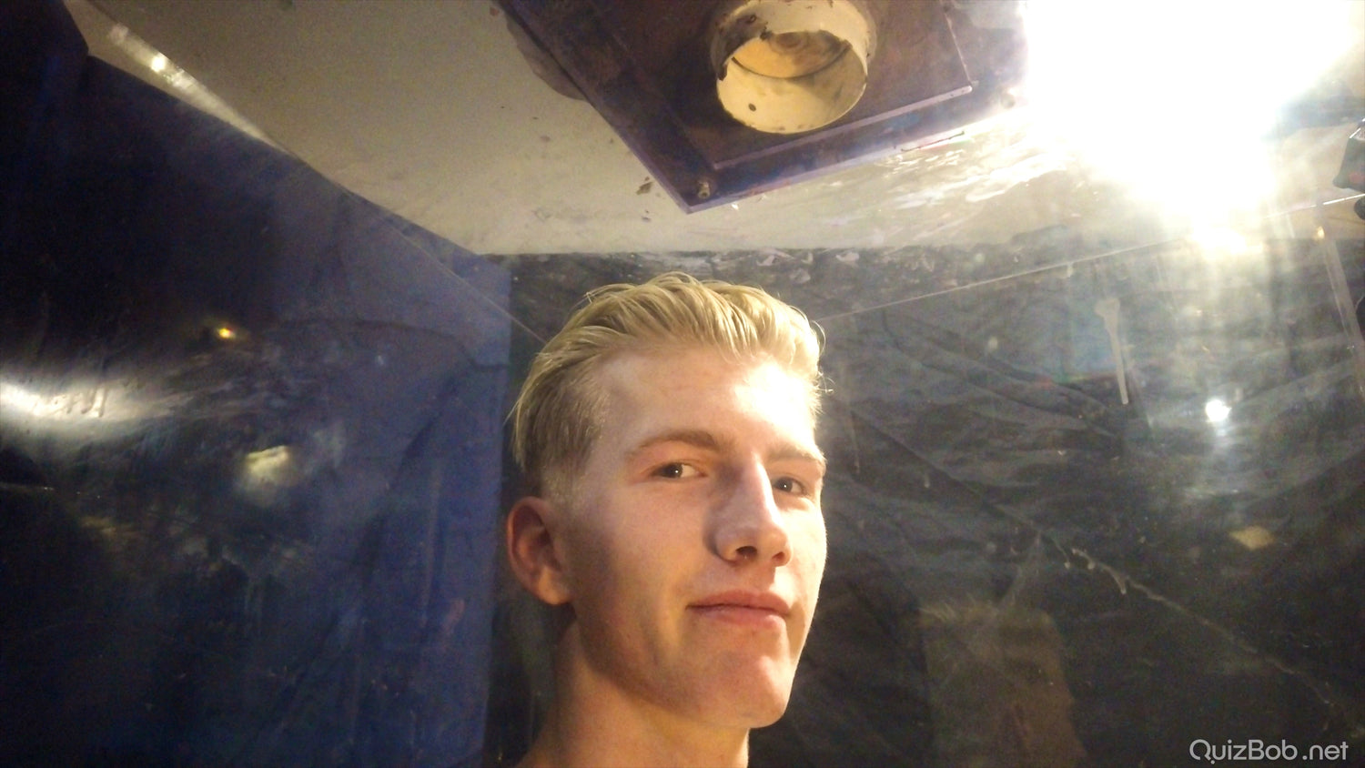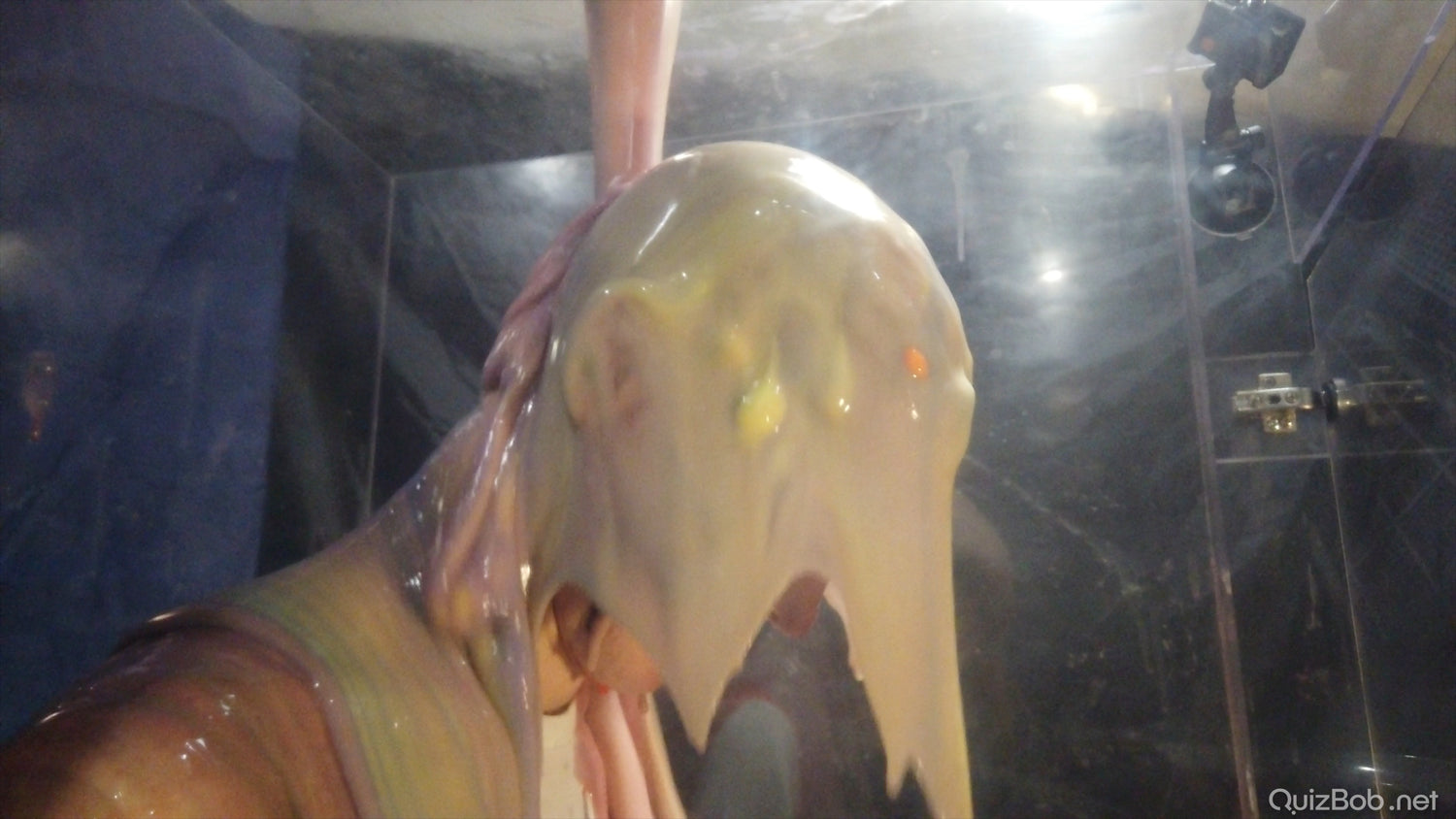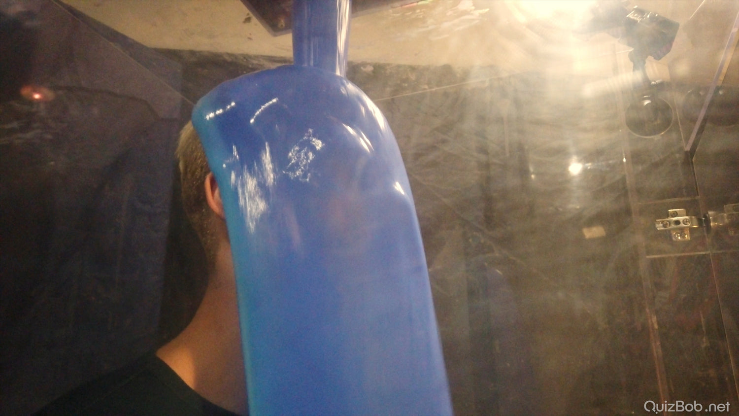 Each time he fails to complete a board in the quiz, a tank of brightly coloured gunge is dropped on him!