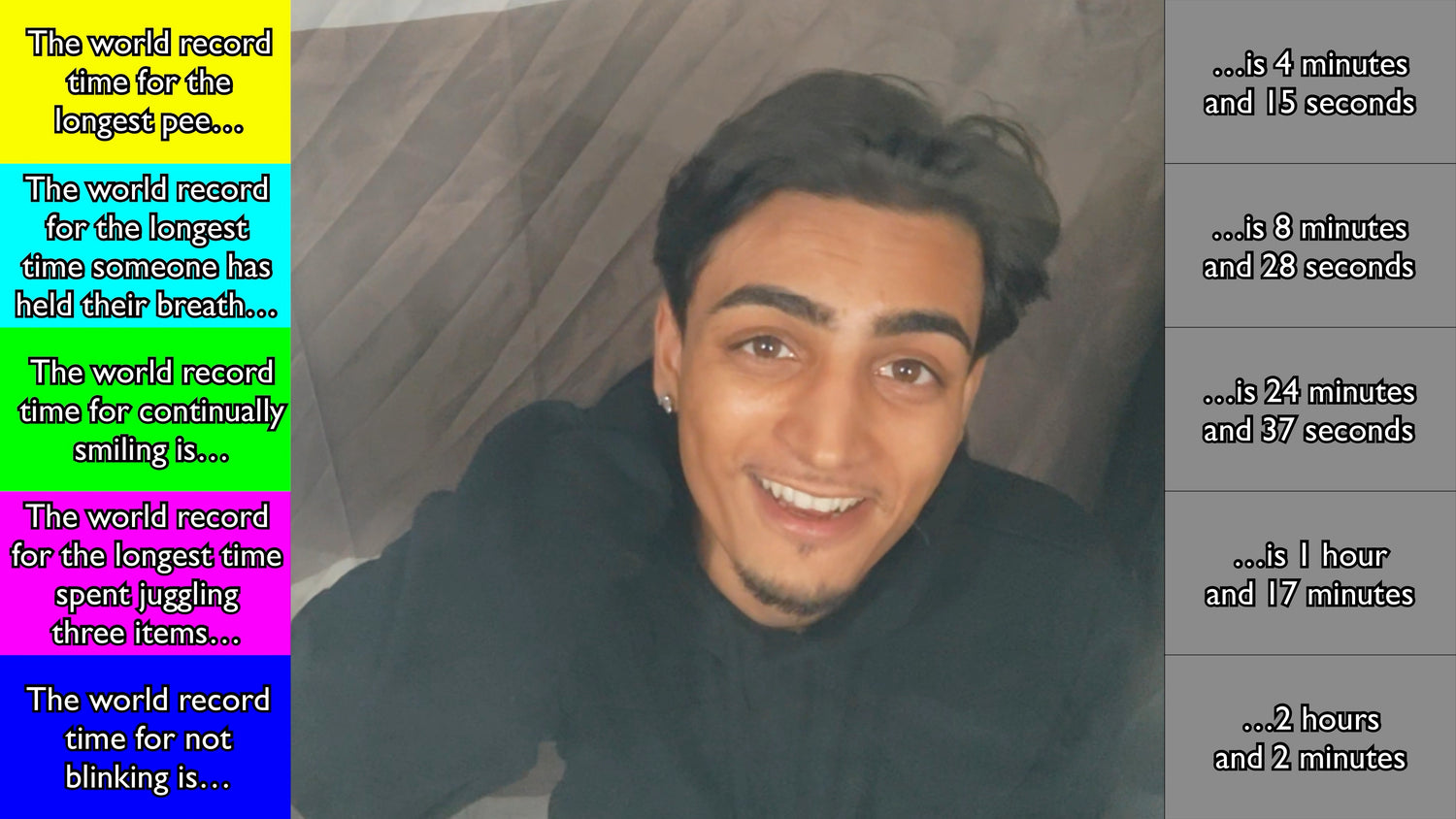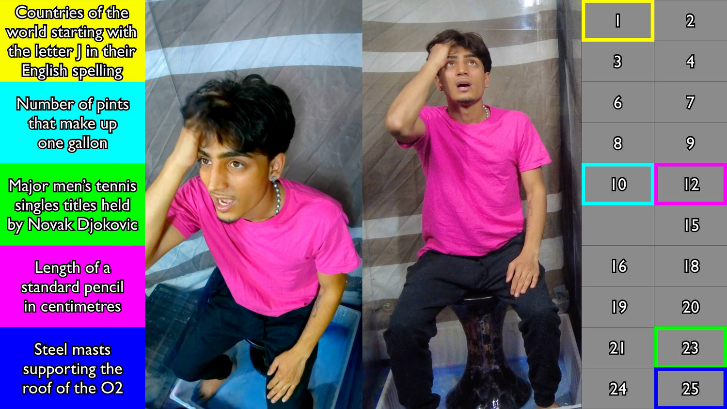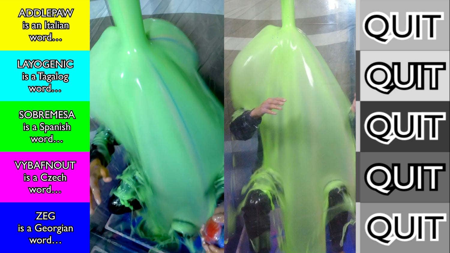 How many points can Jani bank in the first part of the show? Pressing the Quit Button will release the slime but keep his score safe. Giving a wrong answer loses the points as well as seeing the gunge descend on top of him! Three tests give three chances to bank some points - and three chances to release the slime!