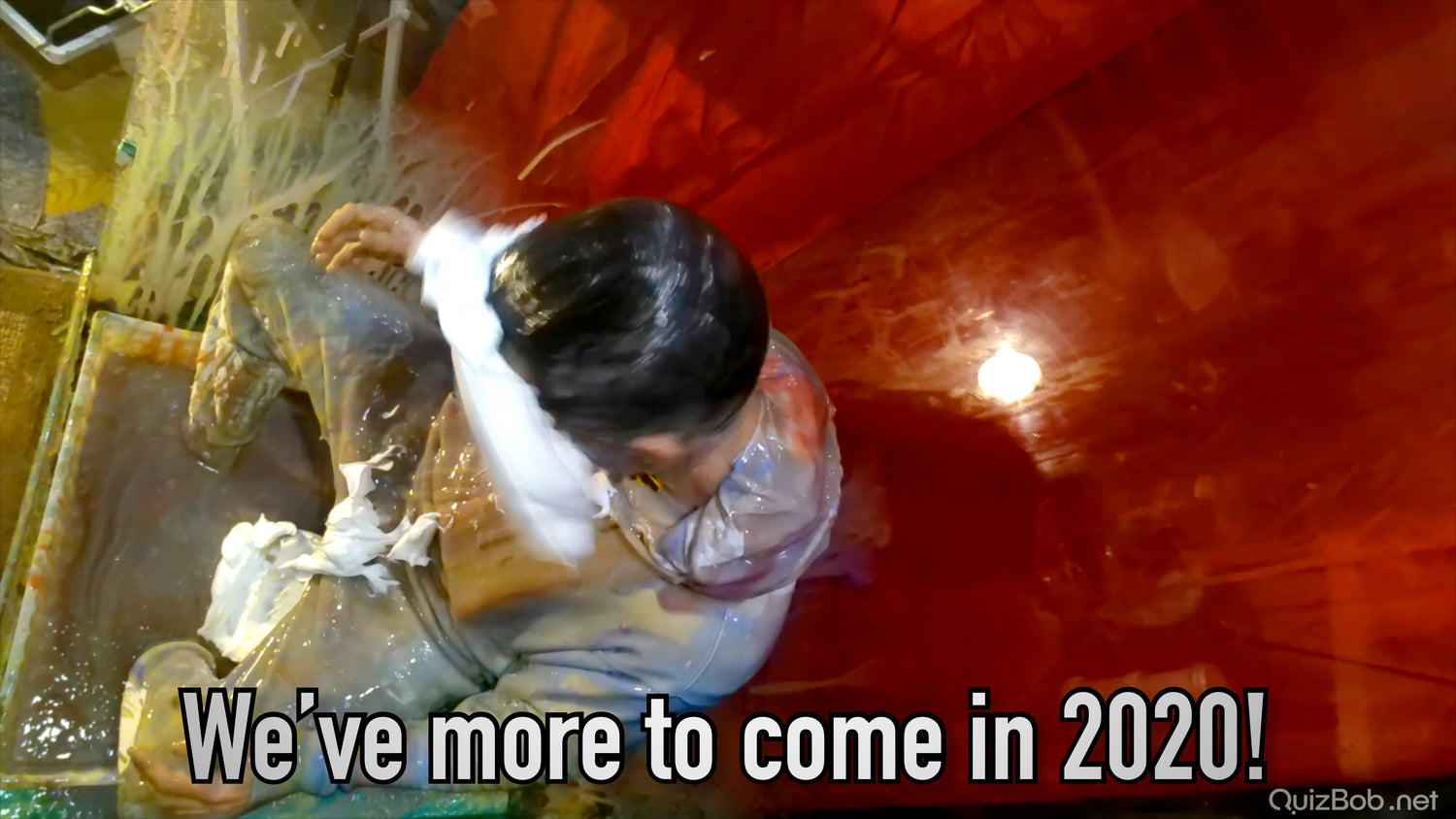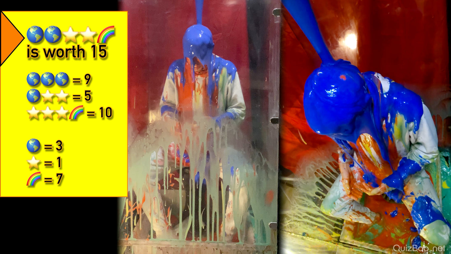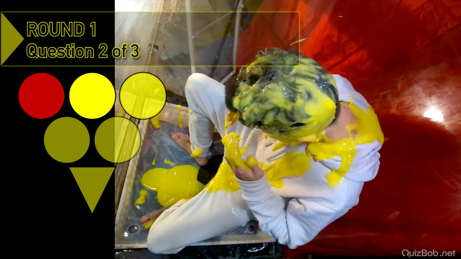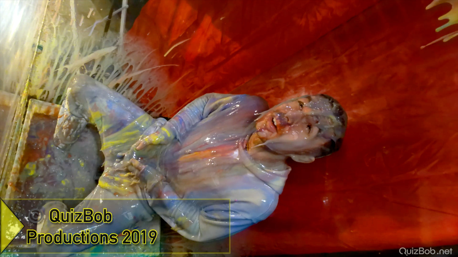 Will he regret wearing his clean white tracksuit? It certainly makes a great blank canvas for colourful slime...