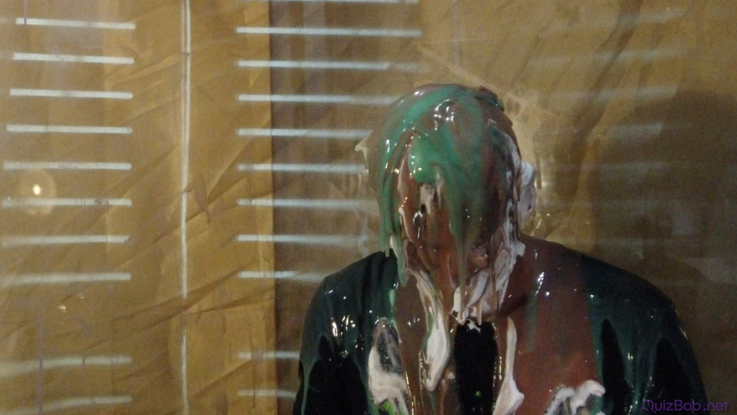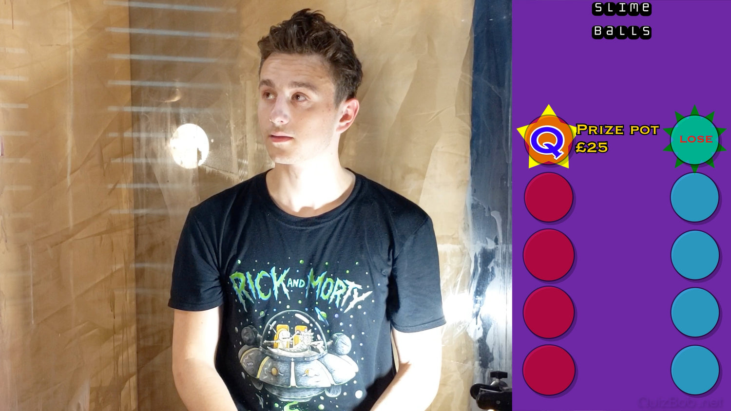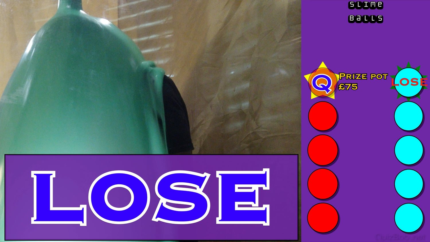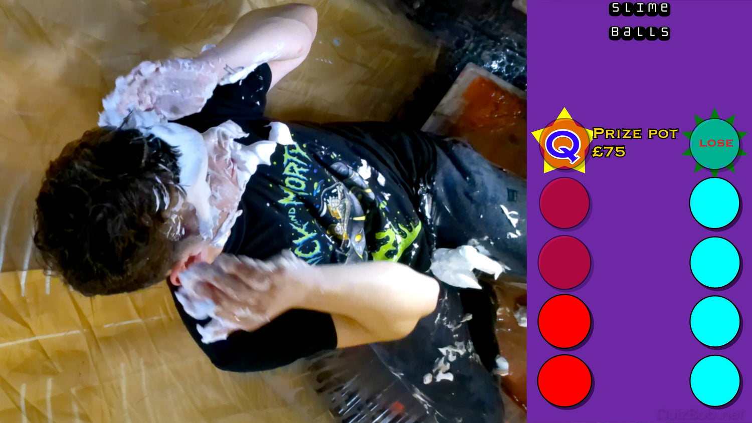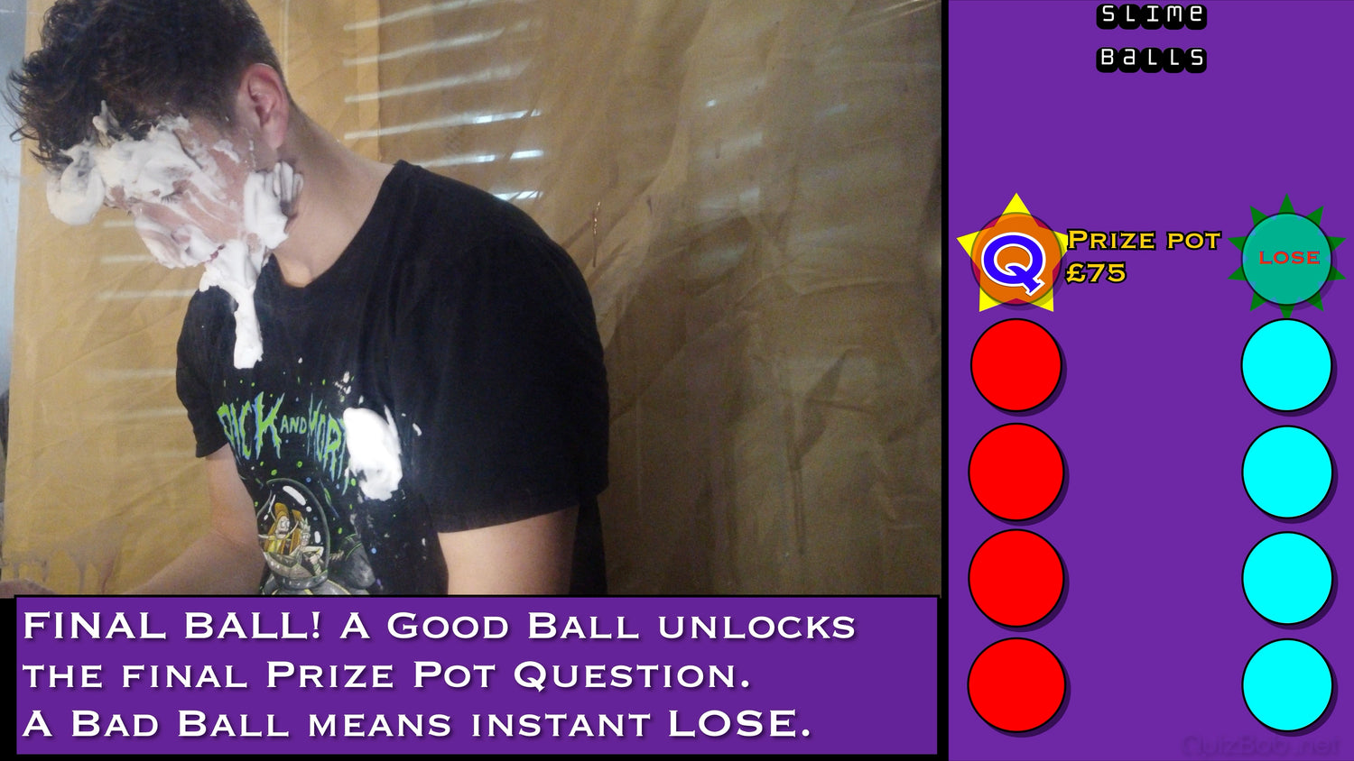 He's hoping to find the Good Balls to add cash to his prize pot. Pull out too many Bad Balls and he won't just risk a pie in the face - he'll not get a chance to answer the final question either. And the price for losing at Slime Balls? We unleash the tank of green gunge sitting above!